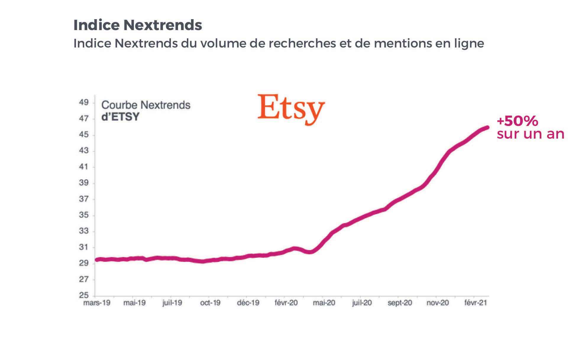 Les différents confinements ont été synonyme de temps retrouvé et l’occasion pour les Français de se réapproprier des savoir-faire : Küche, Gartenarbeit, bricolage mais également peinture, Couture, dessin. Le fait maison alimentaire (Schmerz, yaourts, Pasta) a ainsi augmenté de 60 % en 2020, le do-it-yourself de produits d’entretien et de beauté, de 138 %. Mais c’est surtout la créativité des Français qui s’est exprimée sur l’année écoulée : records du nombre de marques créées (106 000, +7 % vs 2019 selon l’INPI), record du nombre d’immatriculations de micro-entreprises (+9 % vs 2019 selon l’INSEE) et record de trafic sur la plateforme Etsy (+ 50 % selon C-Ways) leader du marché du fait maison pour les bijoux et la décoration. In einem unsicheren wirtschaftlichen Kontext, nous pouvons parler d’une profusion exceptionnelle de micro-producteurs.