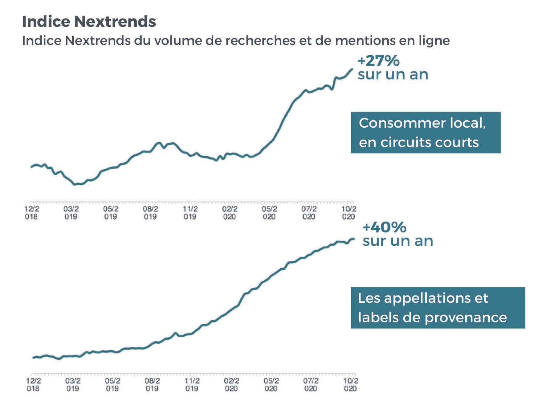 Les recherches web des consommateurs relatives à la production et au savoir-faire français ont augmenté de 28 % en 2020 par rapport à l’année précédente, selon notre étude. C’est une des plus fortes tendances dans un contexte globalement baissier pour la consommation. In der gleichen Logik, les commerces de proximité ont vu leurs recherches augmenter de 38 % et les acteurs des circuits courts de 27 %. Les primeurs ont été les commerces les plus avantagés (+ 44 %). Enfin les labels de provenance (AOP, AOC, IGP) Ont, ihnen, augmenté de 40 % sur la période. Au final, 64 % des Français estiment avoir augmenté leur consommation de produits français depuis le début de l’épidémie et sont prêts à y consacrer un budget plus élevé (Opinion Way, décembre 2020). Les produits alimentaires, les produits de beauté et l’habillement sont les secteurs les plus concernés par cette soudaine accélération du localisme. Un phénomène que tous les facteurs tendent à faire perdurer.