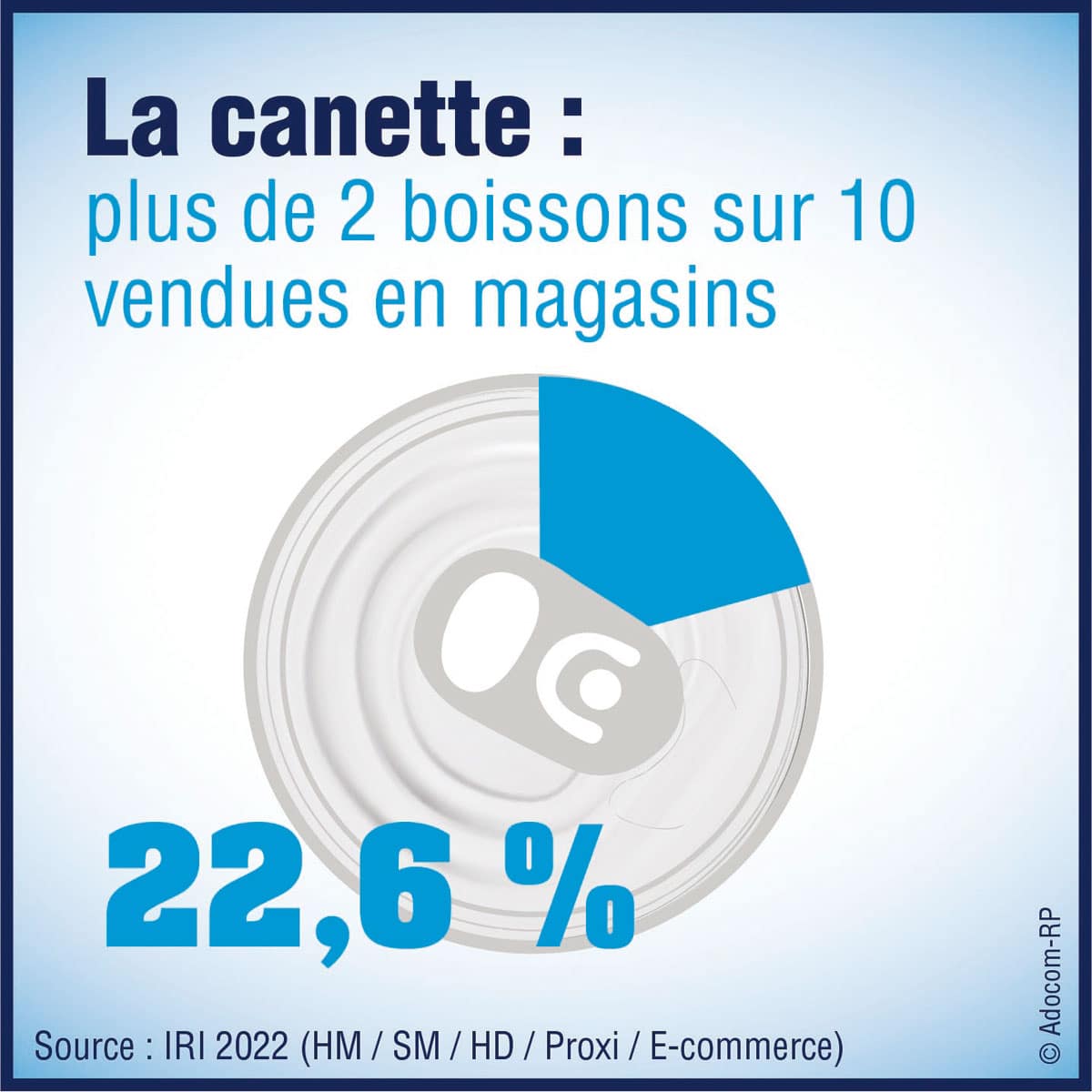 Der Anstieg des Dosenabsatzes ist auf den Erfolg der Softdrink-Dosen zurückzuführen, die weiterhin Marktanteile gegenüber anderen Getränkeverpackungen gewinnen. Im Jahr 2022, Ihr Umsatz stieg um 5,7 Vol.-%. Im Wert, Mittlerweile macht die Dose ein Drittel des Umsatzes dieses Segments aus. Im Jahr 2022, Der Anteil der Dosen am Verkauf von Erfrischungsgetränken in den Geschäften ist auf 0 gestiegen,5 Punkte, um den historischen Anteil von 22 zu erreichen,6 %.