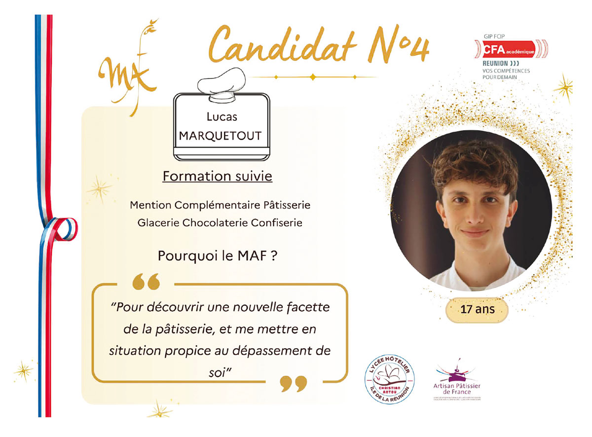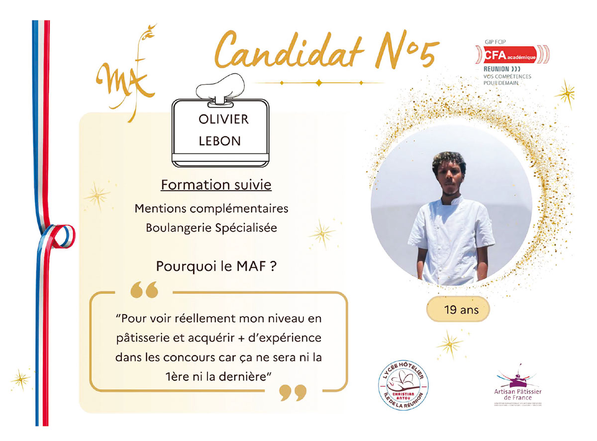 Antou erwähnt außerdem Gebäck, Eis, Schokolade und Süßwaren, forderten sich gegenseitig zum Thema „süße Feste“ heraus. Sie mussten jeweils zwei Reisekuchen in sieben Stunden backen, zwei Königskuchen, zwei Weihnachtsscheite, 24 Törtchen und 24 Pralinen. Die Jury, Vorsitz: Élise Gauger, Finalist des nationalen MAF-Wettbewerbs 2022 und Konditor im Restaurant Les Balançoires in Saint-Gilles les Bains, wählte den Gewinner, der die Insel La Réunion beim nationalen Finale um den besten Lehrling Frankreichs vertreten wird, Spezialität „Konditor“.. Ewan Lample Opéré tritt die Nachfolge von Marine Guignard an, großer Gewinner der vorherigen Ausgabe, Vierter im nationalen Finale für den besten Lehrling Frankreichs ! Das regionale Podium 2024 wird von Nathan Hoarau Ethève und Olivier Lebon komplettiert, belegten im Wettbewerb den zweiten bzw. dritten Platz.