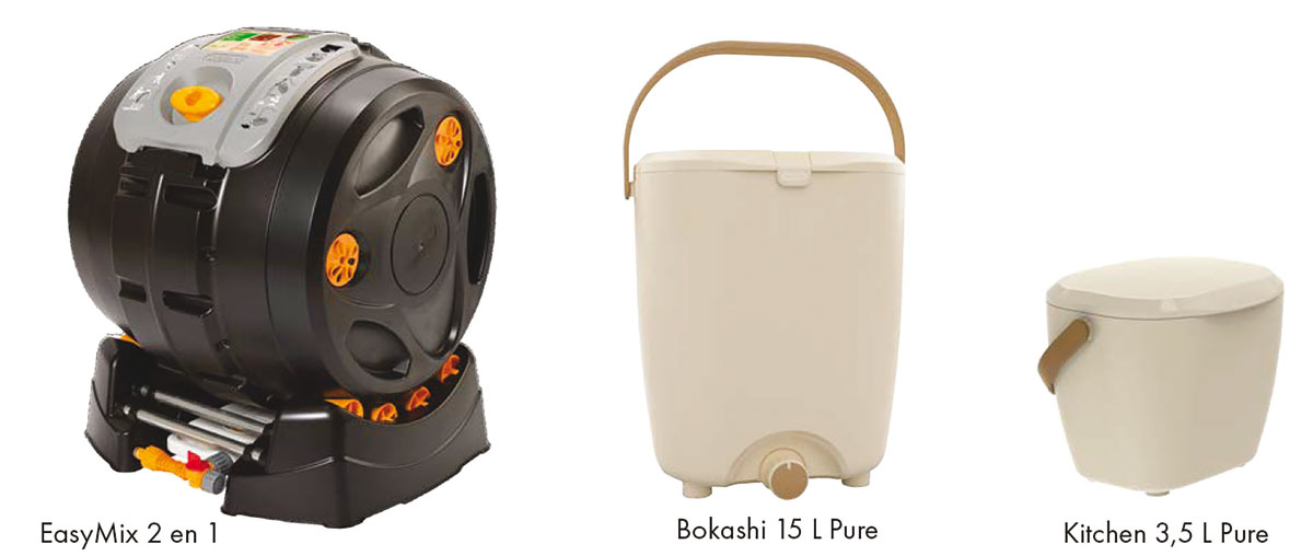 Um Ihren Abfall zu Hause zu recyceln, Hozelock bietet Privatpersonen verschiedene Kompostierungslösungen : der Bokashi 15 L Pure Küchenkomposter, le seau à compost Kitchen 3,5 L Pure, et le composteur rotatif EasyMix 2 en 1.