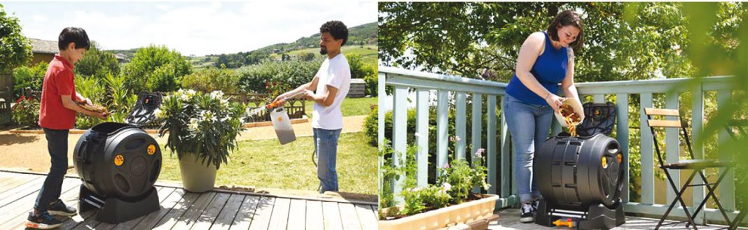 Fabriqué à partir de 90 % de plastique recyclé, le composteur rotatif EasyMix 2 en 1 transforme les déchets alimentaires (épluchures de fruits et légumes, coquilles d’œuf, marc de café…) et les déchets verts (feuilles mortes, fleurs séchées, brindilles…) en compost de qualité pour le jardin et le potager en six à huit semaines au lieu de six mois. Il s’installe dans le jardin, dans un garage, ou même sur un balcon. Posée sur une base à roulette, la cuve de 100 L en forme de tambour se tourne facilement sur elle-même pour brasser les matières organiques. Cette cuve rotative associée à des ailettes d’aération sur le côté accélère la décomposition des déchets. Un couvercle verrouillable évite l’invasion de nuisibles dans le compost et les mauvaises odeurs. Des poignées latérales assurent une manipulation aisée.