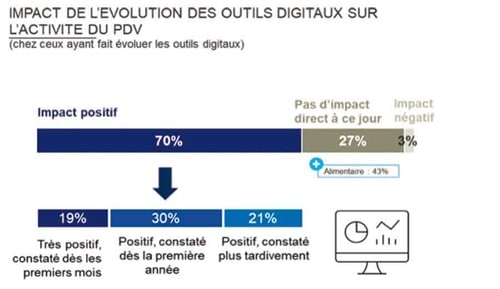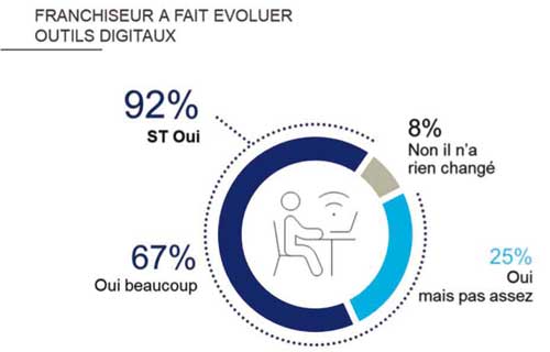 • 7 von 10 Franchisenehmern sind der Meinung, dass sich diese Unterstützung sehr positiv auf ihre Tätigkeit auswirkt, fast die Hälfte davon im ersten Jahr. Die Website ist eines der wichtigsten digitalen Tools, die während der Gesundheitskrise verstärkt wurden : 96 % der Franchisenehmer haben mindestens ein Web-to-Store-System auf ihrer Website : Geolokalisierung von Verkaufsstellen (89 %), Hervorhebung von Werbemaßnahmen (65 %) und Veranstaltungen (57 %) sowie Informationen zu Aktien, die allmählich an Dynamik gewinnen (37 %).