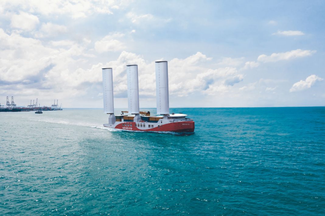 Seit zehn Jahren, In der maritimen Industrie entstehen die ersten Segelfrachtschiffe, hauptsächlich für den Transport von palettierten Gütern oder Paketen auf Anhängern bestimmt. Windcoop ist das erste Unternehmen, das ein Containerschiff mit Segeln ausstattet, Damit wird eine technische und logistische Herausforderung gemeistert : Integrieren Sie ein Velic-System und sorgen Sie gleichzeitig für einen effizienten Containerumschlag. Um das zu erreichen, Windcoop verwendet ein innovatives Design mit einer asymmetrischen Segelanordnung und einem gegenüberliegend positionierten Bordkran, Gewährleistung der völligen Autonomie des Schiffes bei seinen Be- und Entladevorgängen.