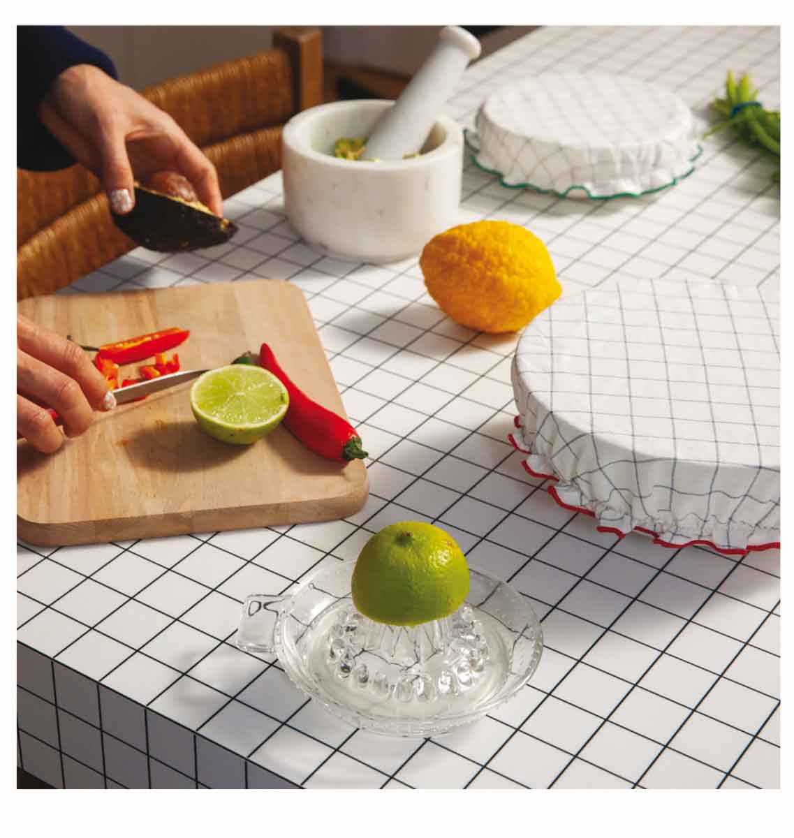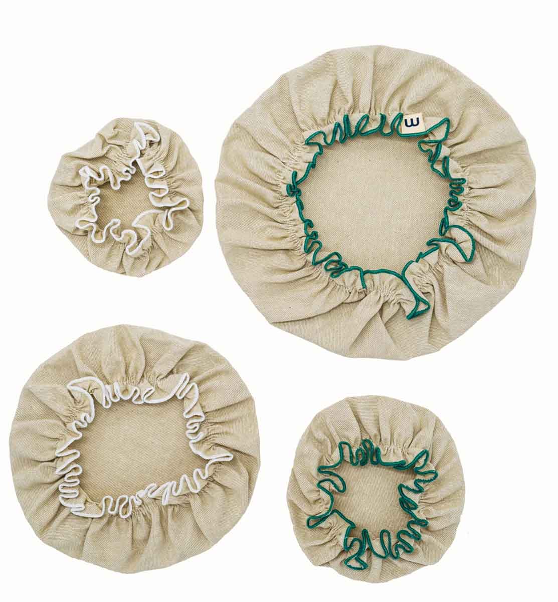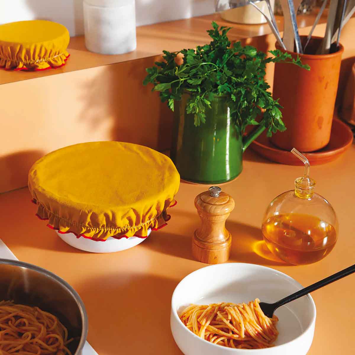 Waschbar und wiederverwendbar "endlos", les couvre-plats en tissu de Wabi Paris se veulent un nouveau geste dans la cuisine pour dire non au film plastique et à l’aluminium.