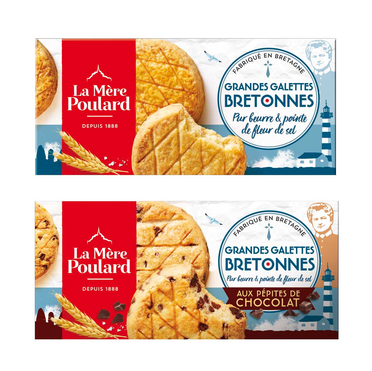 Autre nouveauté packaging par ManEcho, une nouvelle gamme de galettes bretonnes pur beurre finement relevées d’une pointe de fleur de sel, lancée en GMS. Les packagings en fond bleu et blanc de ces nouvelles galettes font immédiatement référence à la recette traditionnelle bretonne des biscuits, ainsi qu’à leur lieu d’origine et de production : la biscuiterie historique de Maen Roch, à quelques kilomètres du Mont-Saint-Michel. Avec un design clin d’oeil aux embruns des côtes bretonnes, l’Hermine en rappel, le pompon rouge de moussaillon, le style illustratif de la Mère Poulard s’affirme et la positionne comme une marque authentique. Le personnage de la Mère Poulard figure d’ailleurs en bonne place sur le facing des nouveaux packagings, comme garante du bon goût au quotidien et de l’exigence de qualité supérieure de la marque.