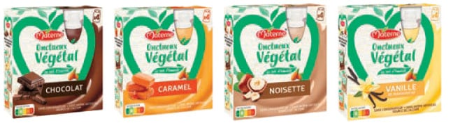 Materne macht seine ersten Schritte mit Desserts auf der Basis von Gemüsesäften oder Milch aus ölhaltigen Früchten (pflanzliche Alternativen zu Milchprodukten). Materne Onctueux Végétal wird aus Gourmet-Zutaten wie Schokolade hergestellt, Vanille oder Karamell, verbunden mit der Süße von Mandelmilch. Ein neues Sortiment, das das Angebot für Erwachsene vervollständigt. „Die Ernährung von Erwachsenen ist oft zu reich an gesättigten Fettsäuren und tierischen Proteinen. Daher besteht ein Interesse daran, die Snacks zu variieren und auf pflanzliche Produkte umzusteigen.. Dieses zu 100 % pflanzliche Sortiment hat den Nutri-Score B und ist eine Kalziumquelle“, erklärt Céline Richonnet., Ernährungsberaterin der MOM-Gruppe.
