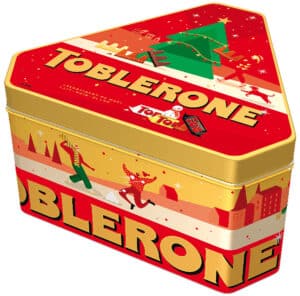 oblerone, die Schokoladenmarke für junge Erwachsene mit ikonischer Form, Zu Weihnachten 2023 gibt es wieder dreieckige Etuis in modernen und attraktiven, farbenfrohen Designs. Die Geschenkboxen werden ebenso wie die neu gestaltete Metallbox wieder angeboten.