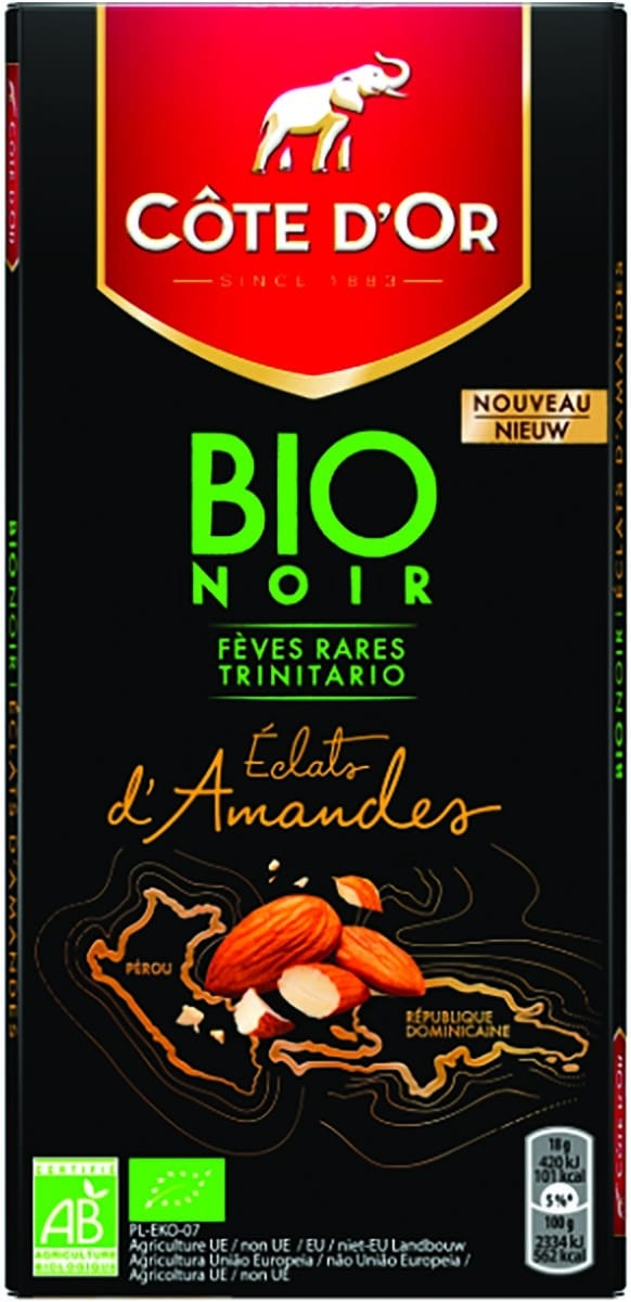 Côte d’Or ist die erste nationale Marke, die 2017 Bio-Schokolade mit einem Probiersortiment aus zertifiziertem ökologischem Landbau demokratisiert hat. In einem Bio-Markt repräsentieren derzeit 8,5 % des Tablet-Umsatzes, Côte d’Or bereichert sein Angebot um einen beliebten Geschmack : die Mandel, deren Verbrauch sich in 10 Jahren verdoppelt hat und die am zweithäufigsten verkaufte Schokolade mit Einschlüssen in Tafeln ist. Die Côte d'Or-Verkostung von schwarzen Bio-Mandelsplittern vereint Genuss und gutes Essen mit seltenen Trinitario-Kakaobohnen, Echte Mandelsplitter und die Bio-AB-Garantie zum günstigen Preis. 90 g Tablette.