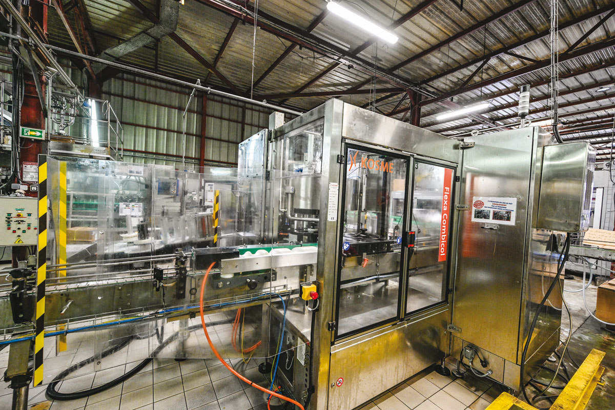 Die Abfülllinie wurde komplett erneuert : links, der automatische Etikettierer; Nach rechts, Der Verpackungsroboter.