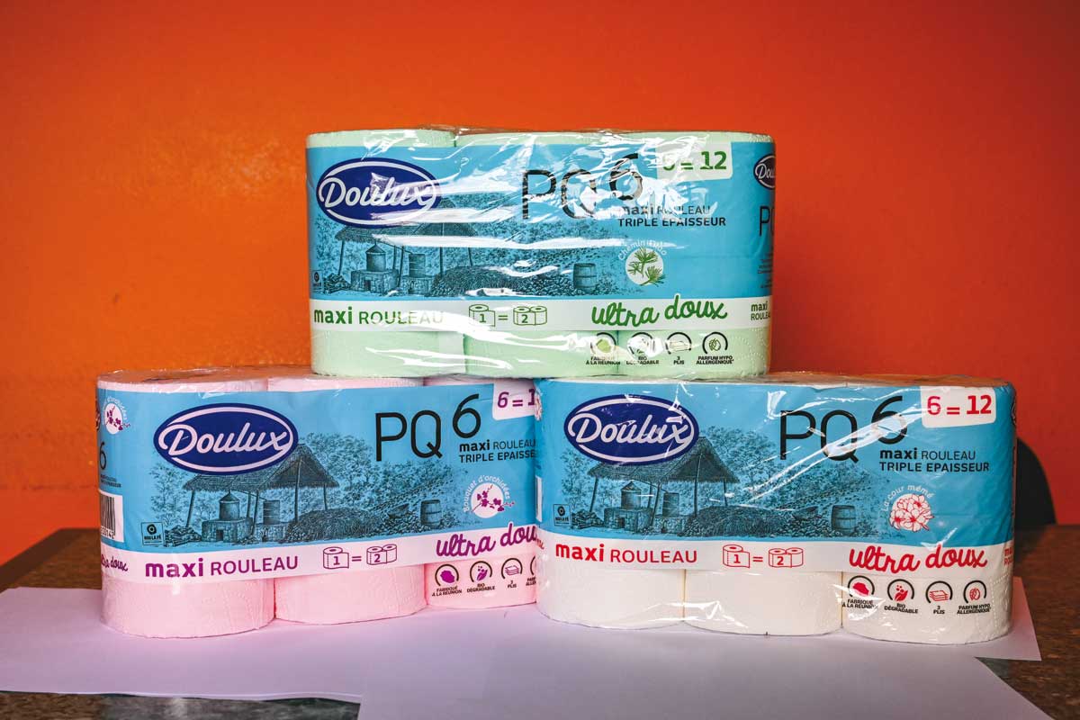 In 2019, Doulux avait rajeuni sa gamme d’essuie-tout avec, among other things, une offre de maxi-rouleaux inédite à la Réunion. This year, c’est au tour des papiers hygiéniques (Parfumés, 4 épaisseurs et Compact) de suivre la voie du renouvellement. De nouveaux gaufrages améliorent l’esthétique des produits. Les essences des papiers parfumés sont garanties hypoallergéniques, et les maxi-rouleaux font leur apparition. Tous les papiers toilette à trois plis (les plus demandés) sont depuis ce mois-ci vendus en maxi-rouleau sans compactage. Soit deux fois plus de feuilles par rouleau, une fréquence d’achat diminuée et moins de plastique d’emballage et de carton (tubes des rouleaux) au kilo de papier. Cette évolution s’accompagne d’une refonte du packaging sur les gammes papier hygiénique et essuie-tout. Le nouveau code couleur de Doulux est bleu pour la famille des papiers hygiéniques et jaune pour celle des essuie-tout. Il affiche l’identité réunionnaise de la marque. Car Doulux a beau avoir plus de 40 ans, une partie de sa clientèle continue de penser qu’il s’agit d’une marque métropolitaine fabriquée localement. Doulux repart donc à l’assaut pour rappeler que ses produits sont conçus et fabriqués à la Réunion. Les couleurs bleu et jaune servent de fond à une série de dessins de paysages réunionnais sur les emballages des packs. On the shelves, ces couleurs distinguent plus nettement Doulux des produits importés. Des bandes de couleur complémentaires, spécifiques à chaque produit, aide le consommateur à les reconnaître. L’information produit est elle aussi améliorée, plus claire et lisible grâce à des symboles (dimension des feuilles, nombre de feuilles, 3 plis, biodegradable, etc.).