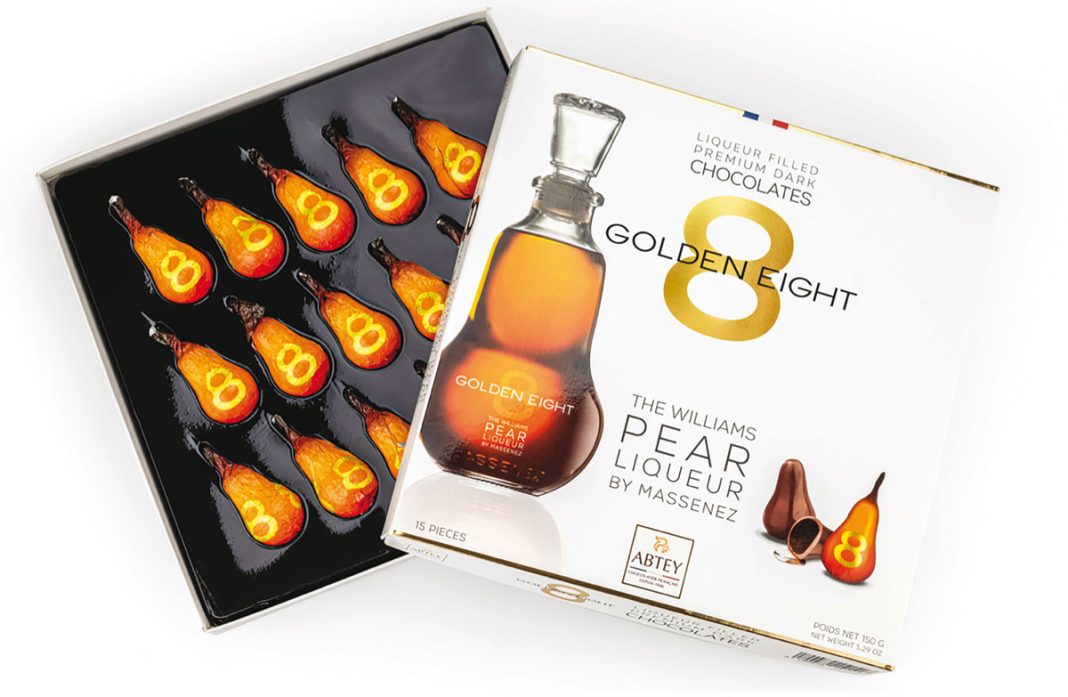 Installées toutes deux au cœur de l’Alsace, à quelques kilomètres l’une de l’autre, Massenez et Abtey partagent les mêmes valeurs : notamment la volonté d’allier tradition et innovation. De cette alliance naît cette année une création à la fois raffinée et locale : les chocolats Golden Eight, mariage entre la délicatesse de la poire Williams et la richesse du cacao. Une collaboration qui célèbre plus de deux siècles de savoir-faire cumulé et le fruit d’un héritage transmis par des familles alsaciennes qui ont su conjuguer tradition, créativité et excellence artisanale. Imaginés par la Distillerie Massenez et façonnés par la Chocolaterie Abtey, les chocolats Golden Eight offrent une expérience gustative particulière. Sous une fine coque de chocolat noir se cache un cœur coulant Golden Eight, liqueur issue d’un assemblage d’eaux-de-vie de poires Williams vieillies huit ans. Chaque bouchée révèle un équilibre entre l’intensité du cacao et la douceur fruitée de la liqueur, dans une forme élégante de petite poire : un clin d’œil au fruit qui donne naissance à Golden Eight.