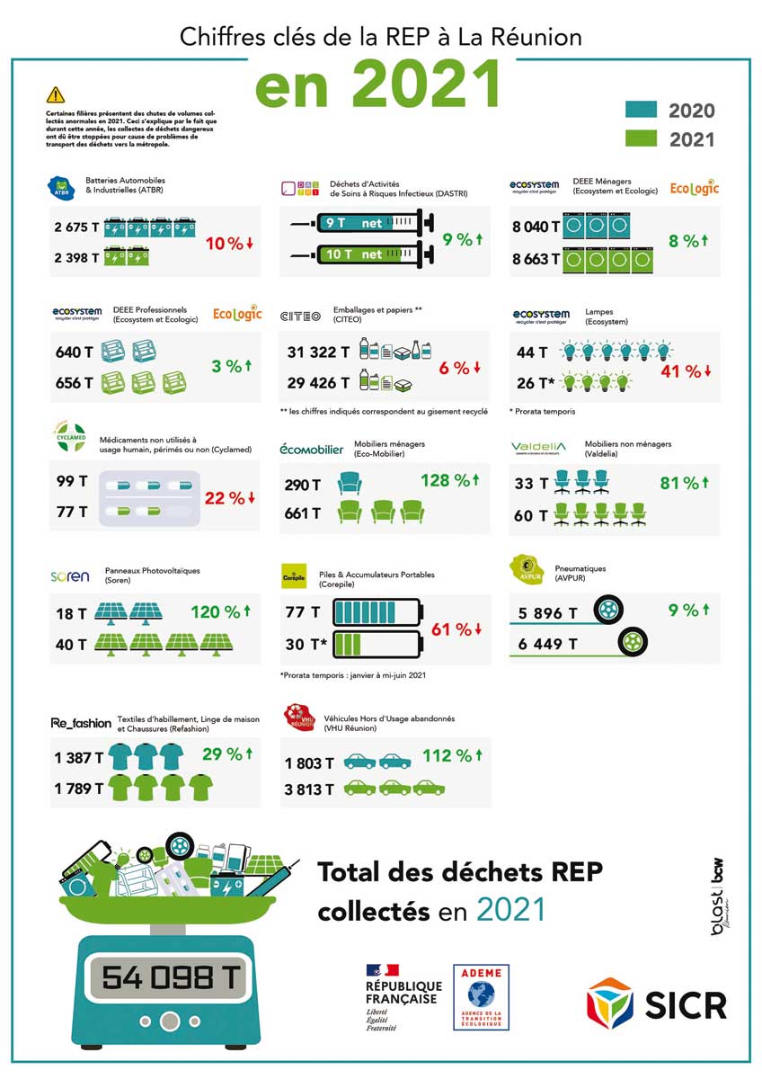 For over ten years, the Réunion Import and Trade Union (SURE) done every year, in collaboration with ADEME, an inventory of the volumes of waste collected in the territory. In 2021, the overall volume of waste collected within the framework of REP sectors stood at 54,098 tonnes, compared to 52,468 tonnes in 2020*. “This 2021 assessment is satisfactory. Indeed, despite the cessation of collections due to problems with the export of hazardous waste for certain sectors, the collection rate shows an overall increase of 3%”, judge Fabrice Hanni, president of the SICR. “This slight increase is explained in particular by the significant deployment of certain sectors in the territory. Eco-organizations work hard throughout the year with their stakeholders to make small territories like Reunion Island a benchmark for the circular economy in the Indian Ocean.”, comments Martine Hippolyte, facilitator of the SICR REP inter-sector platform. “We therefore encourage all players who are not yet there to integrate the REP sector system, whether in terms of prevention, waste management or recovery”, complete Sandrine Sinapayel, environment manager at SICR.