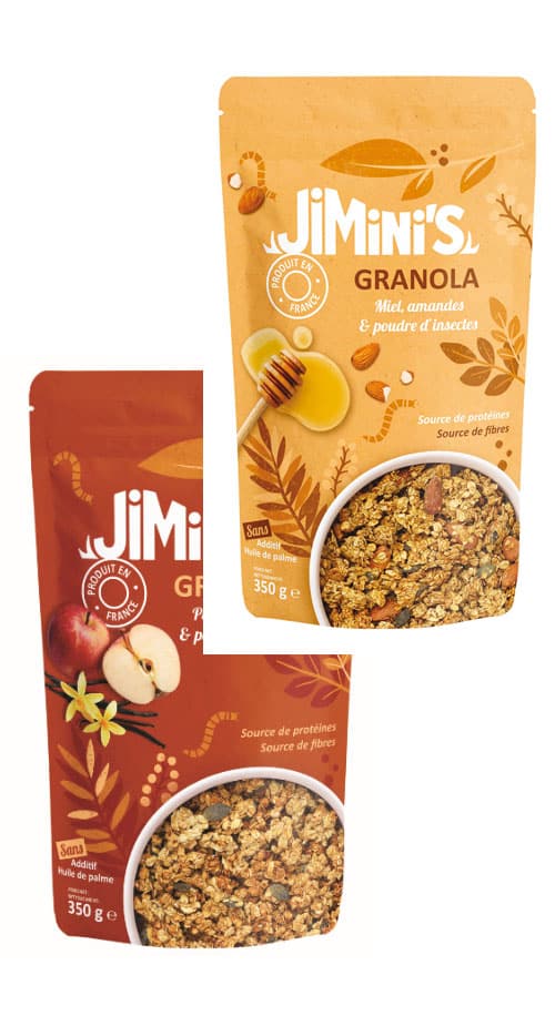 Jiminy's, which offers gourmet products based on whole or powdered insects, unveils two new granola recipes : apple-vanilla and honey-almond.