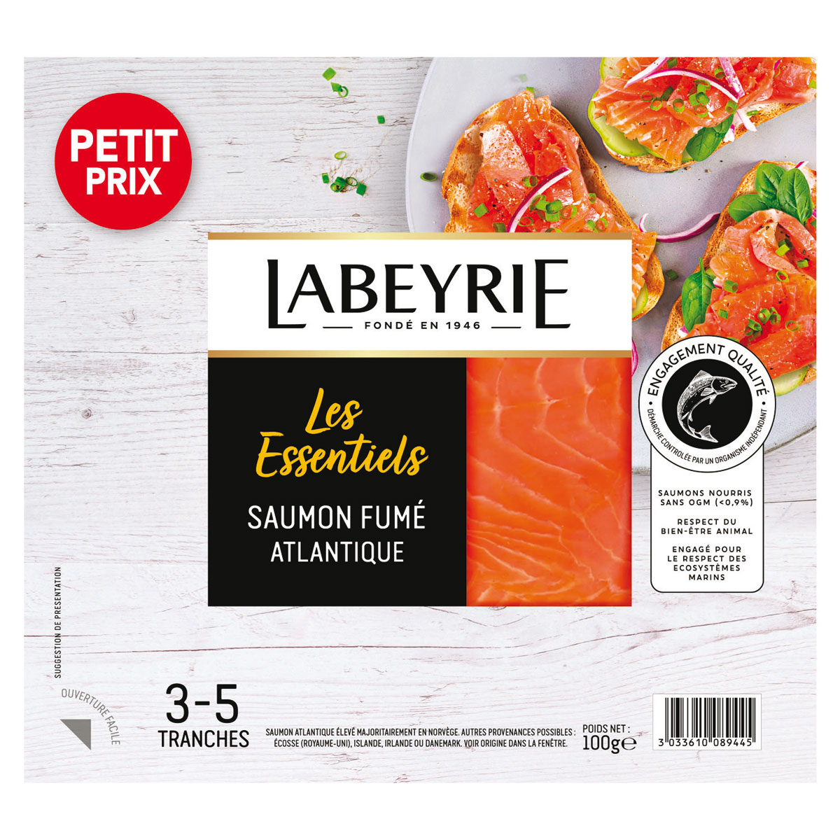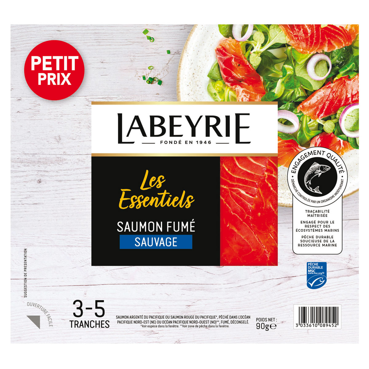 Le Saumon Intensément Fumé Labeyrie. Un saumon d’origine Norvège fumé selon la méthode traditionnelle à la ficelle, aux notes boisées et corsées. Il correspond aux attentes de goût intense de 14 % des consommateurs du marché. Cette nouvelle référence vient enrichir la palette Labeyrie et répond à toutes les attentes du marché (format 4 tranches, 130 g). Les Essentiels par Labeyrie. Une gamme accessible, fidèle aux fondamentaux de qualité de Labeyrie, qui démocratise la dégustation de saumons d’exception au quotidien avec des usages plus simples. Saumon fumé Atlantique 100 g, Saumon fumé sauvage 90 g.