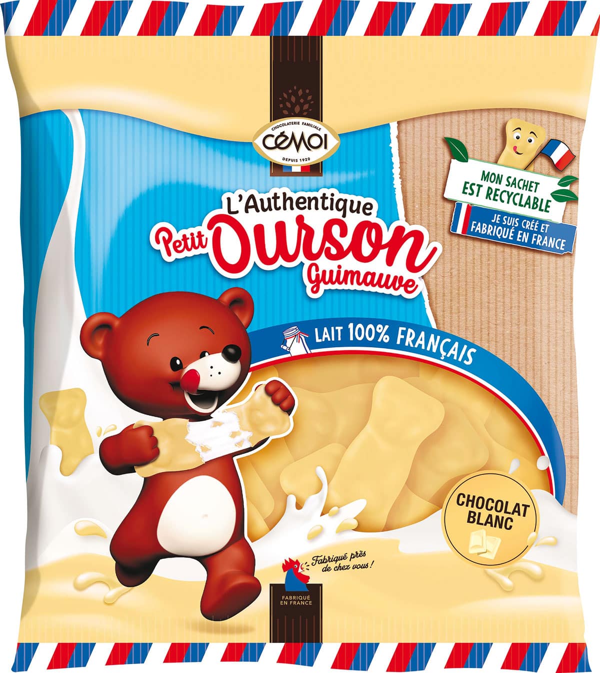 The year 2023 opens a new chapter for the Authentic Little Marshmallow Bear. No more plastic for him and his sidekick the Little Hedgehog Marshmallow and Caramel, sold in bags. The French chocolatier Cémoi has selected paper packaging that is both robust and recyclable. A tricolor border now features prominently on the bag to emphasize the French manufacturing of the two marshmallows.. The new ecological packaging is also produced in France. Gourmet treats, French and more responsible : this is the winning combination of the Little Bear.