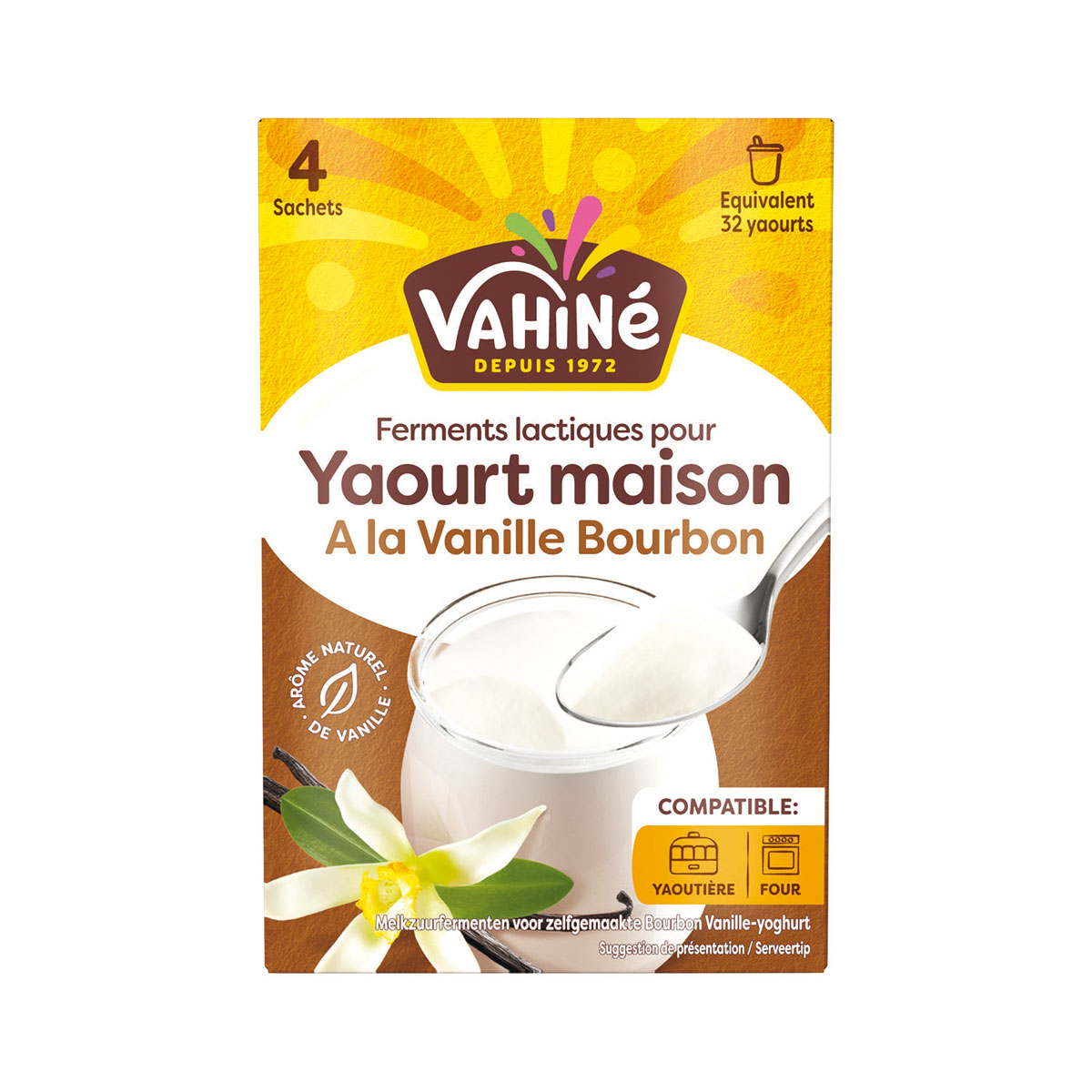 Vahiné innovates and develops the creativity of homemade yogurts via a brand new concept of flavored ferments, available in 3 references : lactic ferments for natural homemade yogurt, homemade Bourbon vanilla flavored yogurt and homemade lemon flavored yogurt. These products can be used in the oven or yogurt maker and sold in a format of four sachets. Now thanks to Vahiné, preparing your homemade yogurt becomes child's play !
