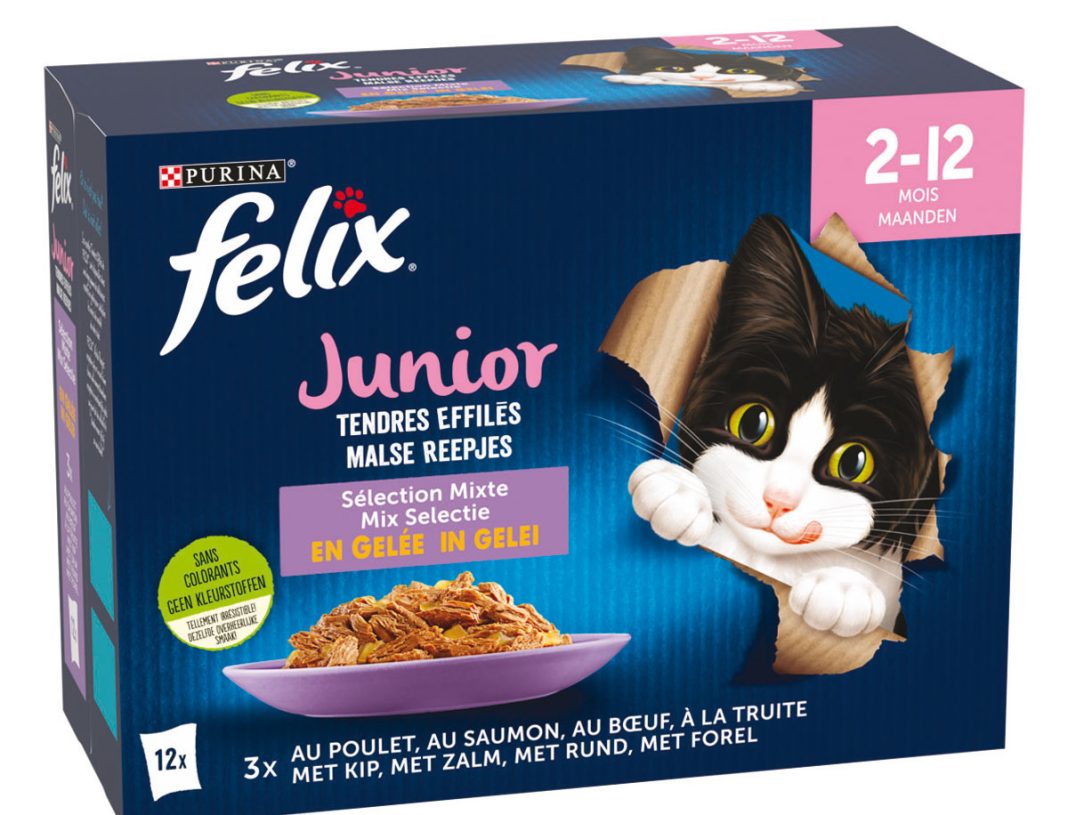 Les associations de textures et de saveurs de la Sélection Mixte en Gelée raviront les sens de l’animal. Sans colorants et sans conservateurs artificiels ajoutés, les repas sont disponibles en sachets individuels déclinés en deux sortes de variétés de poisson et deux sortes de variétés de viande. Fabriqués exclusivement avec des ingrédients de qualité. Autant de nouvelles raisons expliquant pourquoi Félix est la marque préférée des chats. Félix Junior Sélection Mixte en Gelée, en format 12 x 85 g, Chat Portion repas.