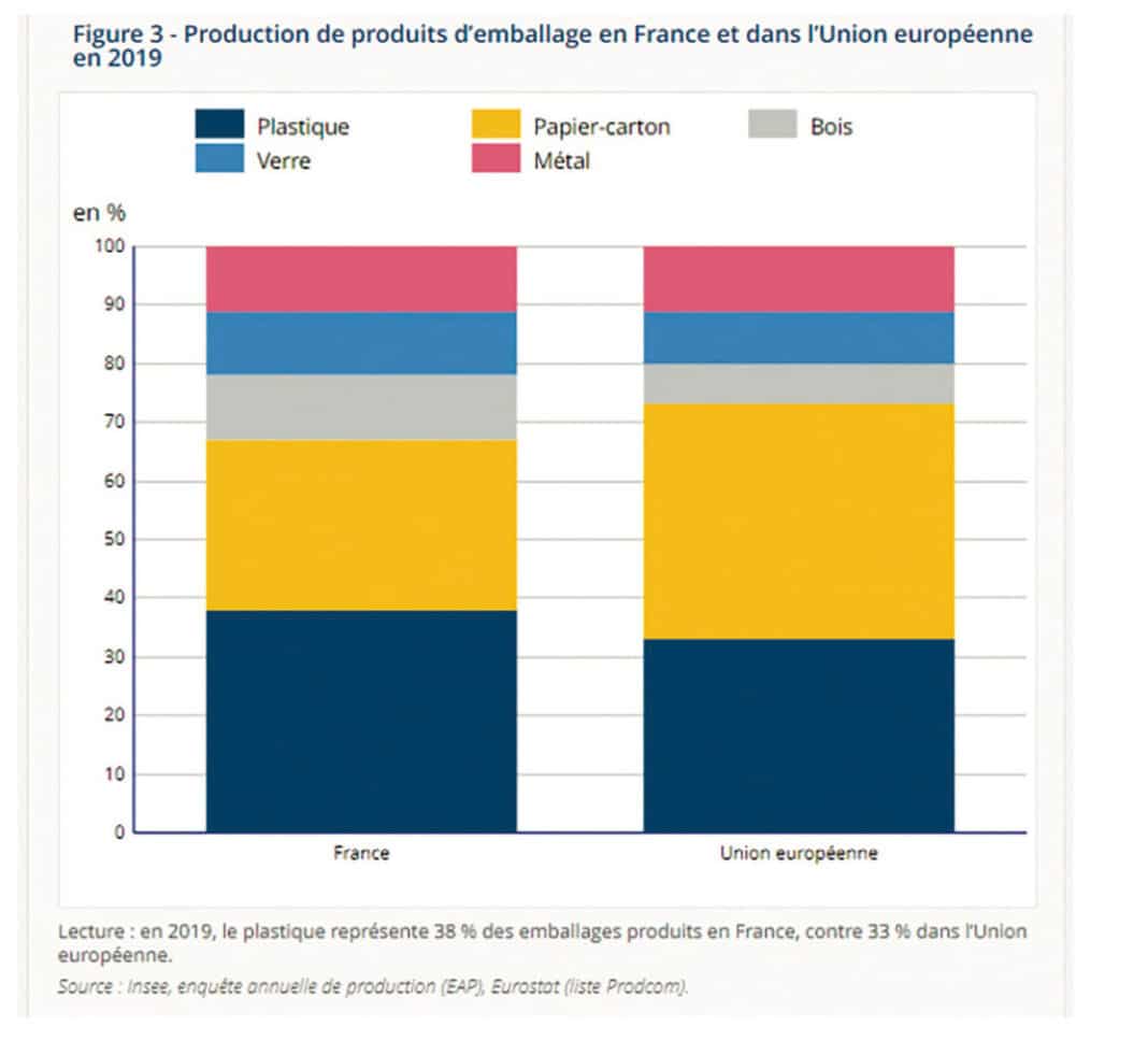 Alors que les emballages en papier- carton occupent la première place à l’échelle européenne, la production d’emballages en plastique reste dominante en France.