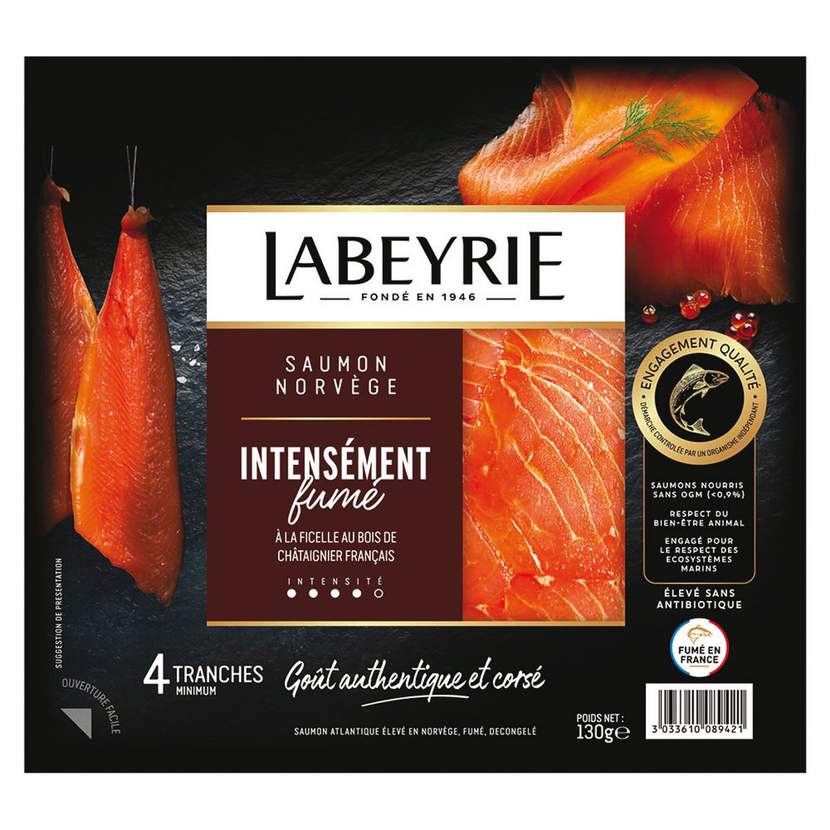 Le Saumon Intensément Fumé Labeyrie. Un saumon d’origine Norvège fumé selon la méthode traditionnelle à la ficelle, aux notes boisées et corsées. Il correspond aux attentes de goût intense de 14 % des consommateurs du marché. Cette nouvelle référence vient enrichir la palette Labeyrie et répond à toutes les attentes du marché (format 4 tranches, 130 g). Les Essentiels par Labeyrie. Une gamme accessible, fidèle aux fondamentaux de qualité de Labeyrie, qui démocratise la dégustation de saumons d’exception au quotidien avec des usages plus simples. Saumon fumé Atlantique 100 g, Saumon fumé sauvage 90 g.