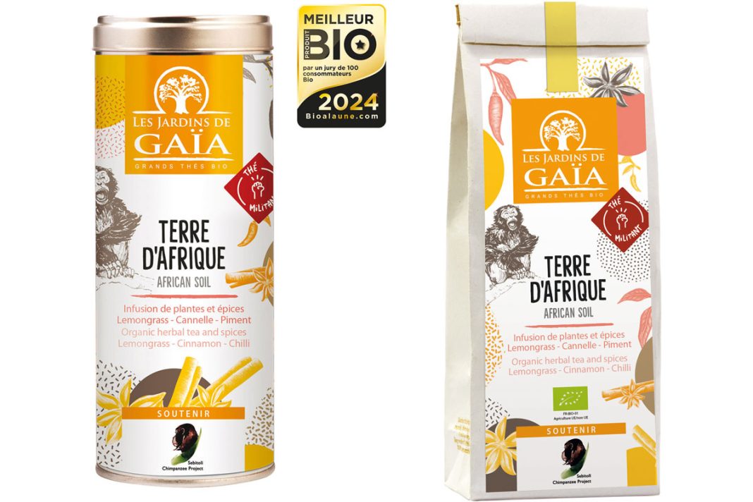 Composée d’un jury de cent consommateurs de bio, la distinction Meilleur Produit Bio récompense tous les ans des produits biologiques et écologiques d’excellence vendus en circuit spécialisé. L’infusion « Terre d’Afrique » et le thé « Sacré Ananas ! » sont tous deux élus meilleur produit bio 2024 dans la catégorie Thé & Infusions. Cette reconnaissance conforte la stratégie de vente de l’entreprise, qui vise à accroître sa présence sur le segment de l’infusion. « Terre d’Afrique » est une infusion de plantes et d’épices colorée, qui associe la douceur de la cannelle aux notes fraîches et citronnées du lemongrass. Des touches de piment et de poivre viennent rehausser l’ensemble. Cette infusion a par ailleurs un goût militant puisqu’elle soutient l’association Projet pour la conservation des grands singes en Ouganda. Pour chaque produit vendu, 50 centimes à 1 € sont reversés à l’association.