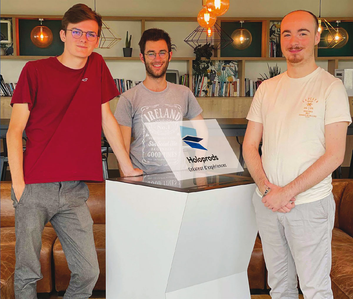 Portée par une équipe issue de L’École LDLC, Holoprods entend faire passer l’holographie du concept au concret, en la mettant littéralement à portée de main. C’est en 2021, dans le cadre d’un projet de création fictive à L’École LDLC, que Valentin Briset, Vianney Bartnig et Baptiste Capelle l’ont B to B. Rapidement, l’idée a dépassé l’exercice académique. En 2023, la société Holoprods était officiellement lancée. Adaptées aux usages B to B, les bornes sont personnalisables et offrent un large éventail d’applications : visualisation de produit en 3D, présentation immersive de service, jeux et quiz interactifs, médiation culturelle ou touristique, borne d’achat et de commande, démonstrateurs techniques. Compactes (110 cm de hauteur sur 60 cm de largeur), robustes et transportables, elles sont conçues pour une mise en œuvre rapide sur site, avec ou sans mobilier sur mesure. Elle intègre des enceintes Alpine pour la diffusion sonore et un système de détection gestuelle sans contact. Le contenu interactif est entièrement scénarisé avec le client.