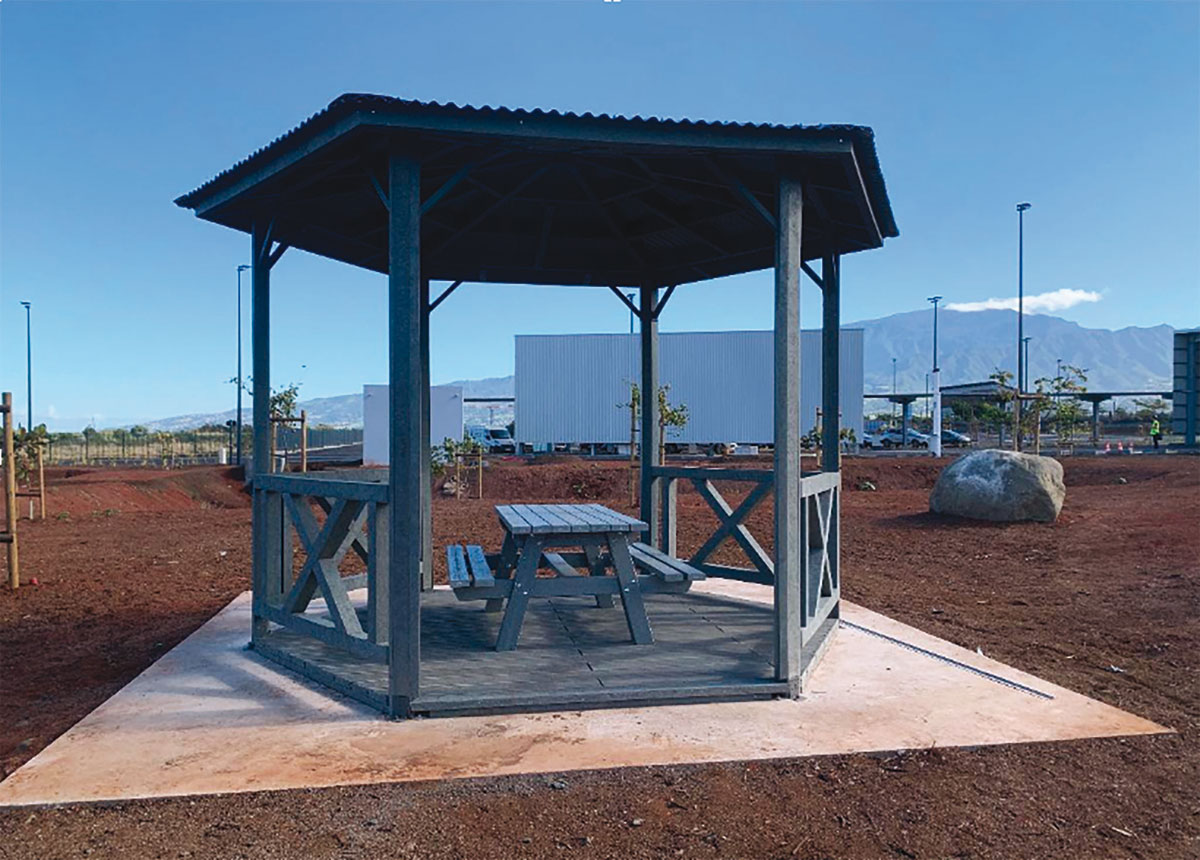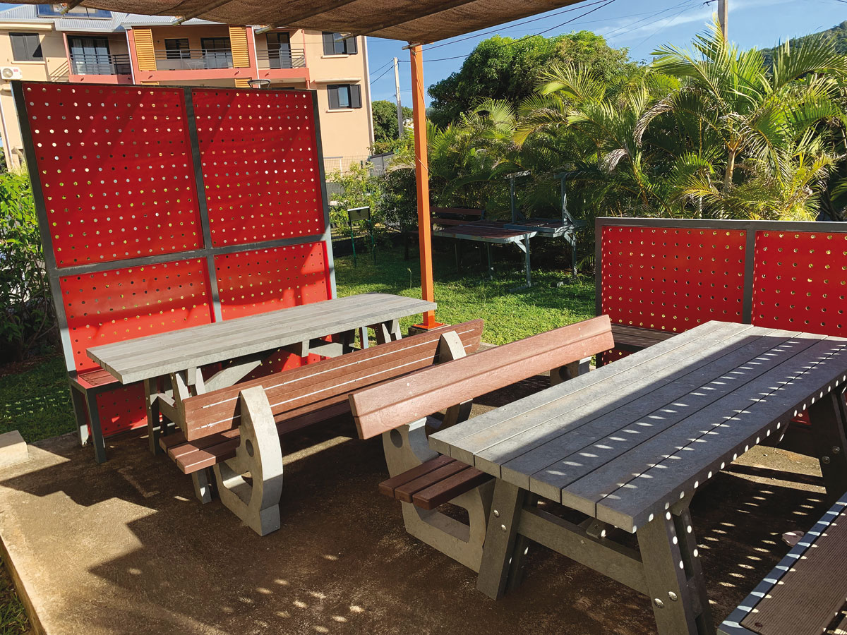 Ici et là, des mobiliers urbains en plastique recyclé apparaissent dans l’espace public à l’initiative de clients convaincus par la durabilité du matériau. Pour développer son usage, BA Eco, filiale du groupe Deleflie et seul importateur de poutres et planches en plastique recyclé, a conclu un partenariat avec Empreinte Réunion, jeune entreprise spécialisée dans la fabrication et la pose de mobilier urbain et d’extérieur.