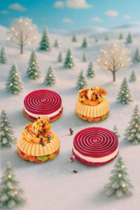 Mini-brioches vertes garnies de pesto rosso et décorés de graines de cranberry et de sésame. Bûche glacée aux oursons (chocolat noir, vanille et au brownie au cacao) dans leur petit lit. Bouchées de légumes en forme d’oursons. Oursons en crème glacée chocolat façon guimauve.