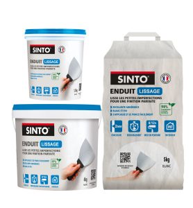 Les enduits de lissage en pâte Sinto éliminent les petites imperfections restantes, jusqu’à 2 mm d’épaisseur. Faciles à appliquer et à poncer, ils créent une base uniforme pour un mur lisse. Prêts à l’emploi, ils sont proposés en formats de 4 kg et 1,5 kg. L’enduit de lissage en poudre Sinto lisse les petits défauts, éclats, rayures et autres imperfections également jusqu’à 2 mm d’épaisseur. Il est proposé en format de 5 kg. Offrant une finition blanche et soignée, ces deux enduits de lissage ont un rendement d’environ 2,5 m2 pour 1 kg d’enduit.