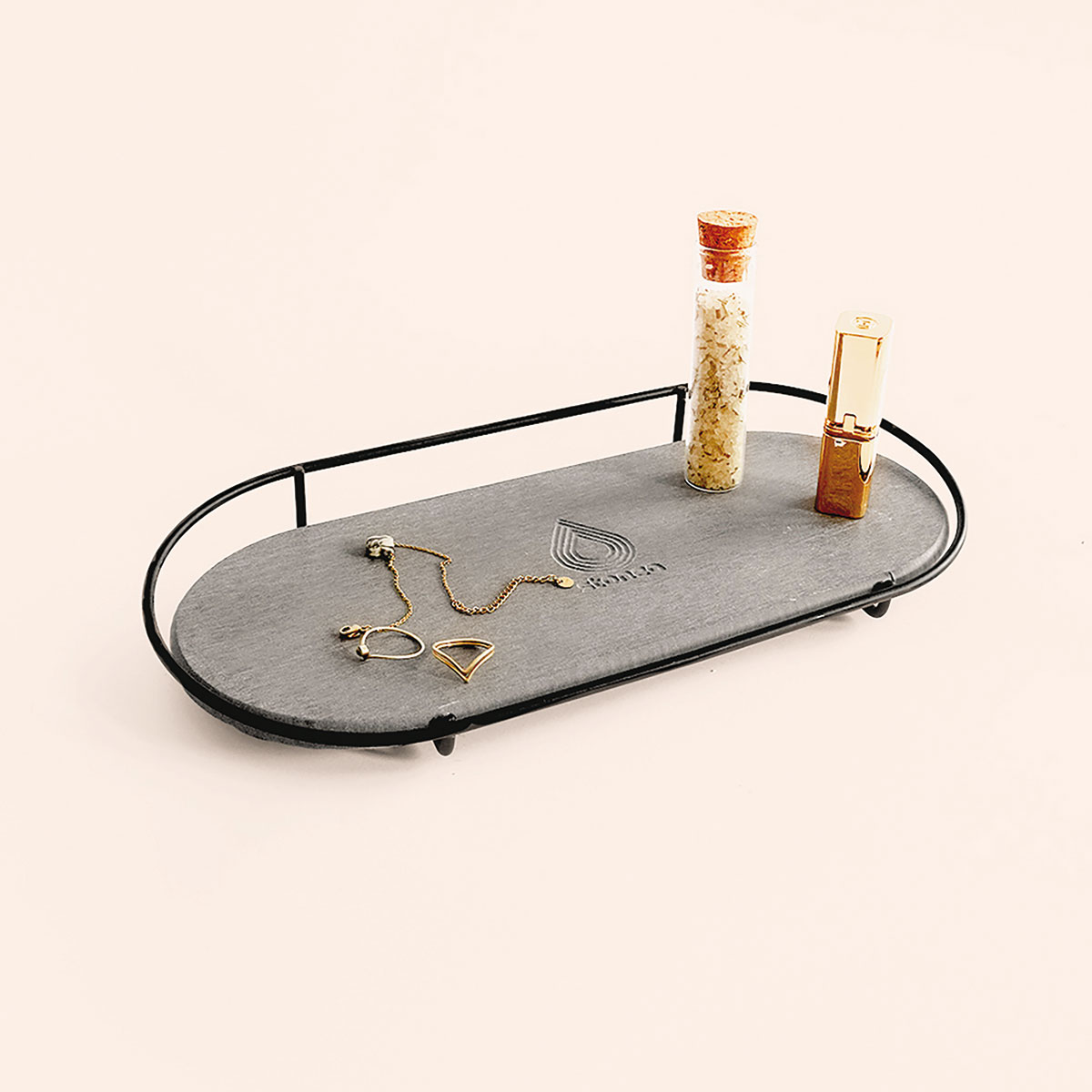 Makea est un plateau minimaliste en diatomite, facile à nettoyer et qui s’intègre parfaitement à l’univers déco de la salle de bain. Il permet de disposer son maquillage, savon, parfum, ses bijoux et produits de soin. La diatomite empêche la croissance de moisissures et de bactéries dans les produits dans un environnement aussi humide que la salle de bain, évitant qu’ils ne se détériorent prématurément.