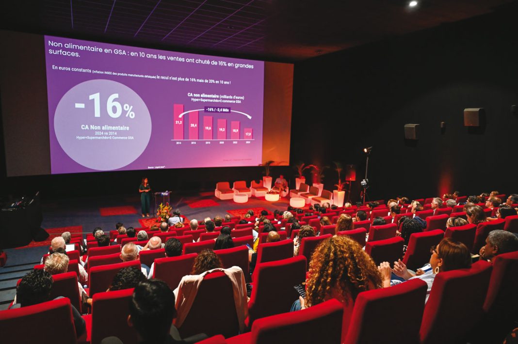 En 2025, le binôme hypermarché-supermarché reste dominant dans l’univers du commerce, mais nettement moins qu’il y a dix ans (de trois quarts à deux tiers). Le chiffre d’affaires du non-alimentaire a reculé de 16 % sur dix ans. La grande distribution a resserré son offre de PGC-FLS * sur l’alimentation solide.