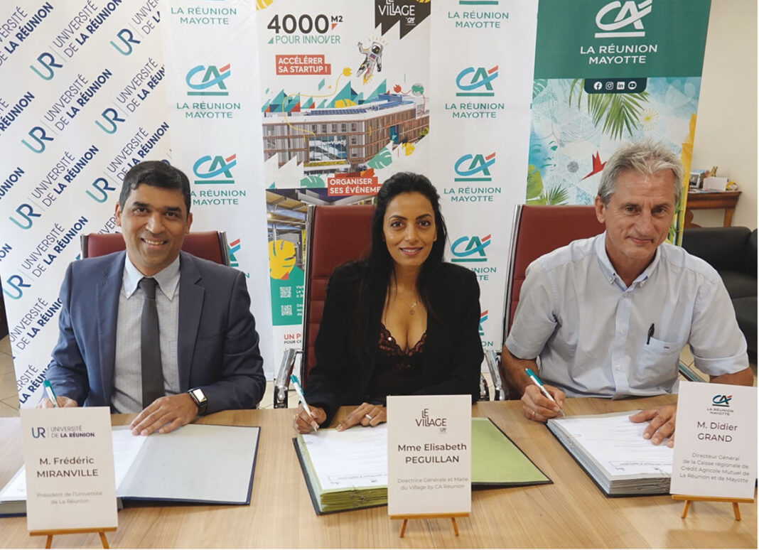 En 2018, l’université de La Réunion, le Crédit Agricole de La Réunion-Mayotte et le Village by CA Réunion opéraient un rapprochement stratégique et opérationnel de leurs activités dans l’optique de favoriser l’insertion professionnelle des étudiants de la seule université française et européenne de la zone océan Indien. Le 5 septembre, en présence de Frédéric Miranville, président de l’université, de Didier Grand, directeur général de la caisse régionale du Crédit Agricole, et d’Elisabeth Peguillan, directrice générale du Village by CA Réunion, les trois entités ont renouvelé et amplifié le partenariat qui les unit pour trois années. Les parties entendent ainsi travailler ensemble à l’amélioration de l’avenir de la jeunesse du territoire. Trois domaines d’intérêt commun prioritaires ont été ciblés. Le développement de l’orientation, la formation et l’insertion professionnelle à travers stages, campagnes d’alternance, organisation de jobs dating. La promotion de la recherche, l’innovation, la créativité et l’esprit entrepreneurial par l’accompagnement des chercheurs, la valorisation des innovations sous forme de start-up, la sensibilisation à l’entrepreneuriat. La lutte contre la précarité étudiante en consolidant l’épicerie solidaire, en agrandissant le jardin partagé du campus du Moufia et en créant une boutique solidaire sous forme de food truck pour les étudiants du Sud. Ce partenariat tripartite renouvelé prend en particulier tout son sens pour le Village by CA Réunion, qui entend mettre en place de nouvelles actions pour intégrer les étudiants à sa dynamique de création d’activité et d’innovation.