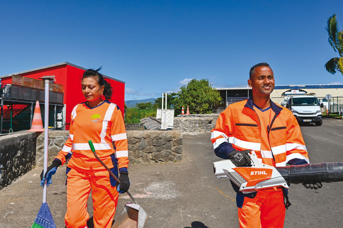 Amela Pingret et Mike Dubourg portent la combinaison de travail de Valderun, la filiale de SUEZ Recyclage et Valorisation Réunion en charge depuis 2023 de l’exploitation des déchèteries de la Cinor. Ils font partie des 25 agents de déchèteries qu’emploie SUEZ à La Réunion. Mike Dubourg travaille à la déchetterie de Commune Bègue depuis son ouverture, il y a 15 ans. Pamela Pingret l’a rejoint il y a 4 ans. Accueillant des usagers de Sainte-Suzanne, Sainte-Marie et Saint-Denis, la structure applique une réglementation imposant le contrôle des accès et la réception des matières, en particulier des matières dangereuses, par du personnel habilité. Pamela Pingret et Mike Dubourg ont l’œil bienveillant mais attentif à ce que les déchets soient déposés correctement et au bon endroit. Il y a un enjeu permanent dans ce travail. Après le premier tri des usagers eux-mêmes, la déchèterie joue le rôle de pré-tri : en amont de la partie industrielle, le pré-tri réduit au maximum la part de matériaux non conformes dans les gisements de déchets qui seront ensuite traités dans des centres de tri plus spécialisés (comme Val OI ou le centre de tri des encombrants d’Inovest), avant d’être recyclés, soit localement, soit en métropole ou à l’étranger.