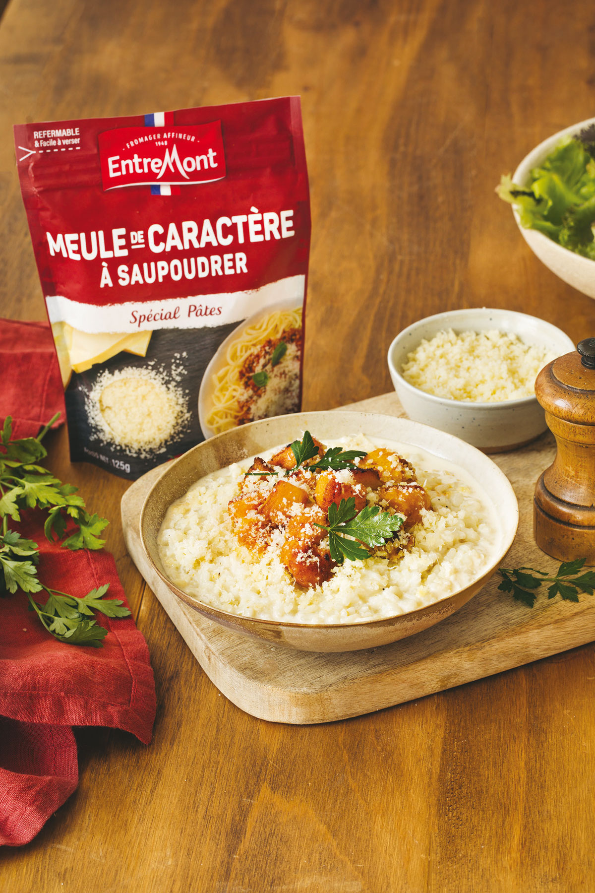 昂特蒙, 法国奶酪专家, 将 Meule de Caractère 撒在磨碎的部分用于意大利面.