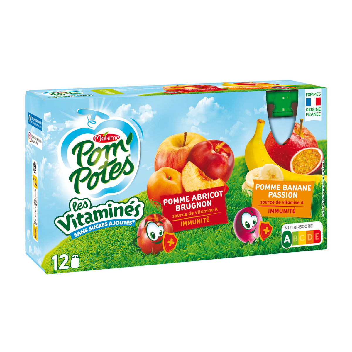 Pom’Potes Les Vitaminés a pour ambition de renforcer la vitalité et l’immunité des enfants au moment du goûter, avec des compotes aux bénéfices nutritionnels augmentés. Sa nouvelle gamme est toujours « sans sucres ajoutés », 更多的, en plus d’être composées de délicieux mélanges de fruits soigneusement sélectionnés, les recettes sont complétées par des vitamines reconnues pour avoir des effets bénéfiques sur la vitalité et l’immunité des enfants. La nouvelle gamme Pom’Potes Les Vitaminés comprend cinq références. Pom’Potes Vitalité avec les deux recettes : pomme-poire-kiwi, 维生素C的来源 ; pomme-mangue-banane-kiwi-orange, source de vitamines A, B6 et C. Et Pom’Potes Immunité avec les trois recettes : pomme-fraise-gelée royale, source de vitamines A et B ; et pomme-abricot-brugnon et pomme-banane-passion, sources de vitamine A.