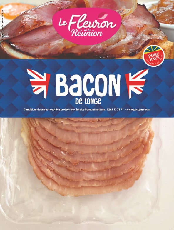 英国特色培根, 那里的传统, 对我们来说没有更多的秘密. 事实证明,100% 当地猪肉制成的留尼旺培根甚至更好,因为它来自更瘦的肉,因此尝起来脂肪较少。, 比进口培根切片. 质地非常嫩, 建议将 Le Fleuron de la Réunion 乡村培根作为所有热奶酪特色菜的配菜. 它也可作为早午餐和晚餐开胃酒。.