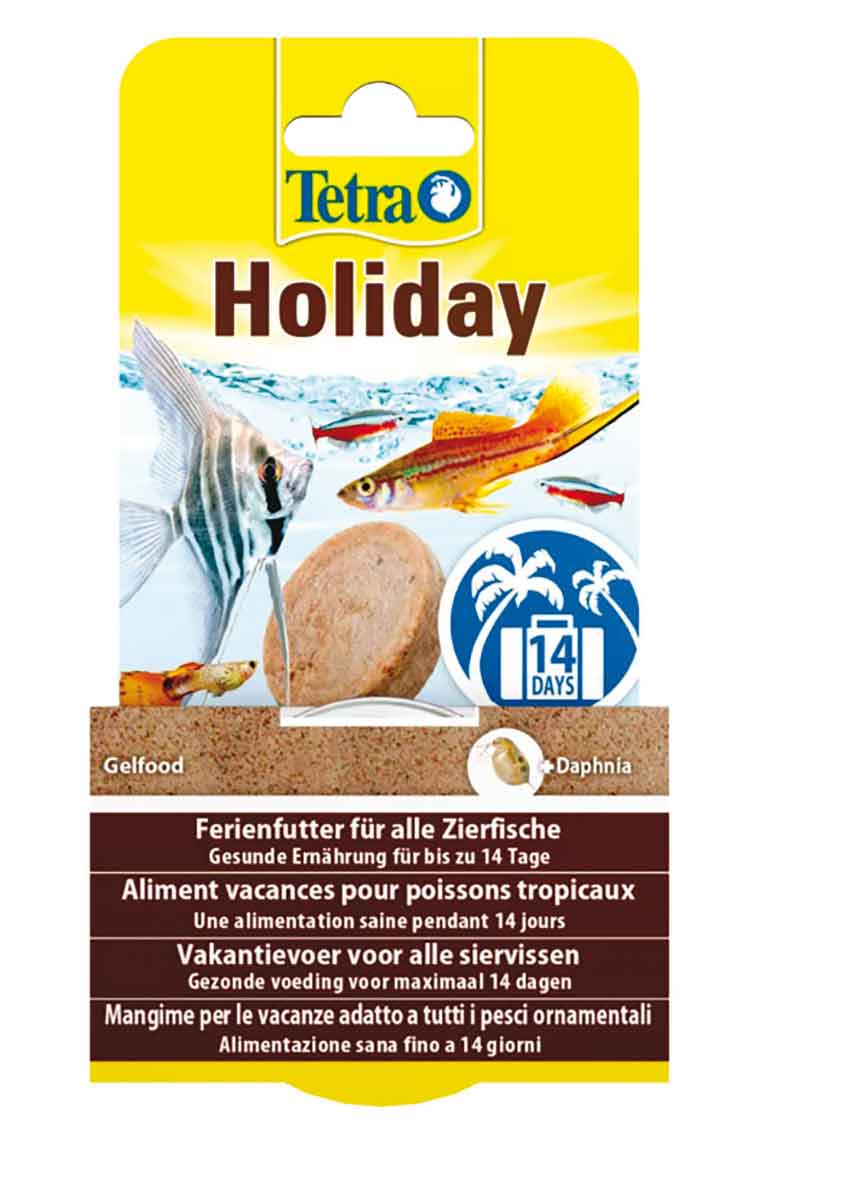 对于去度假的鱼主来说, 如果家里没人来喂鱼, 两种解决方案 : TETRE myfeeder 自动喂食器或 Tetra Holiday“节日”食品.