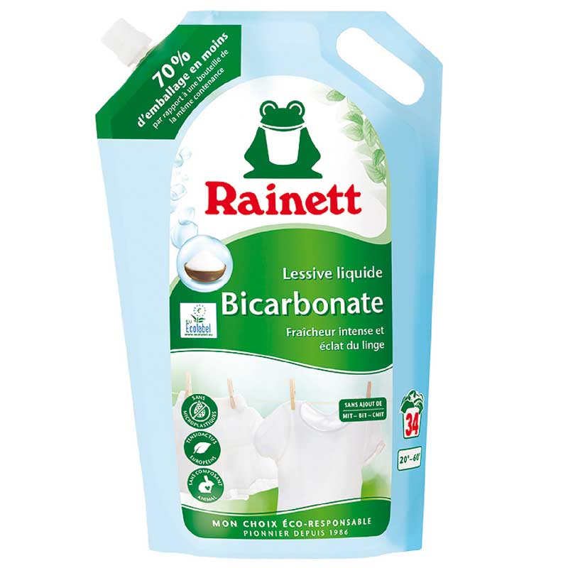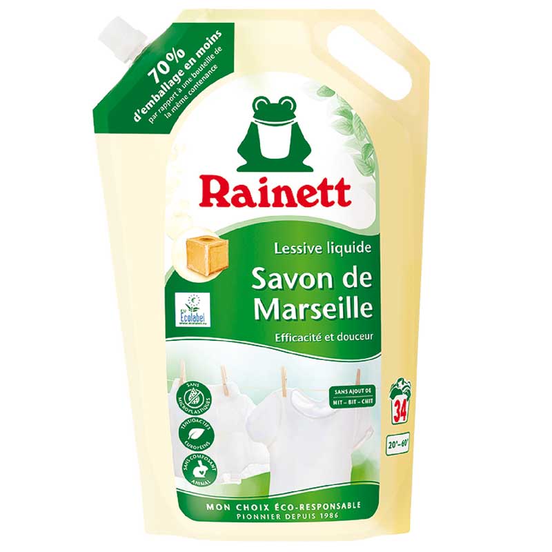 受控内饰, 致力于室内空气质量的独立标签. Rainett 杏仁洗衣液保证极低的污染物排放 (冠状病毒) 在室内空气中, 尤其是当衣服在屋内晾干时. Rainette 杏仁洗涤剂以 1L 生态补充装形式出售,与其他三种 Rainett 芦荟洗涤剂参考一样。, 含马赛皂和碳酸氢盐. 与相同容量的瓶子相比,这款柔性袋可节省 70% 的包装费用,并且允许您在家中多次重复使用瓶子.