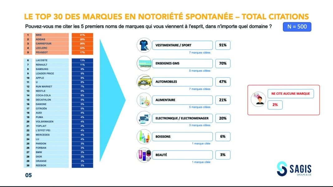 最清晰的教学, 这是进入列表的条目, 极其明显, 大型零售品牌. 2005年, 当问题被问到时, 产品品牌很多,品牌几乎没有. 今年, 当我们选取引用次数最多的 30 个品牌时, 你在前五个中找到了两个品牌, 即家乐福和勒克莱尔. 第二个教训涉及某些品牌随着时间的推移的持久性. 我说的是排名前列的耐克和阿迪达斯, 情况已经如此, 大约二十年前. 这些运动服饰品牌的吸引力并未减弱. 另请注意, 与第一课相关, 迪卡侬进入排名. 大型零售品牌正在收获过去二十年来开展的重大沟通和意识培养工作的成果。.